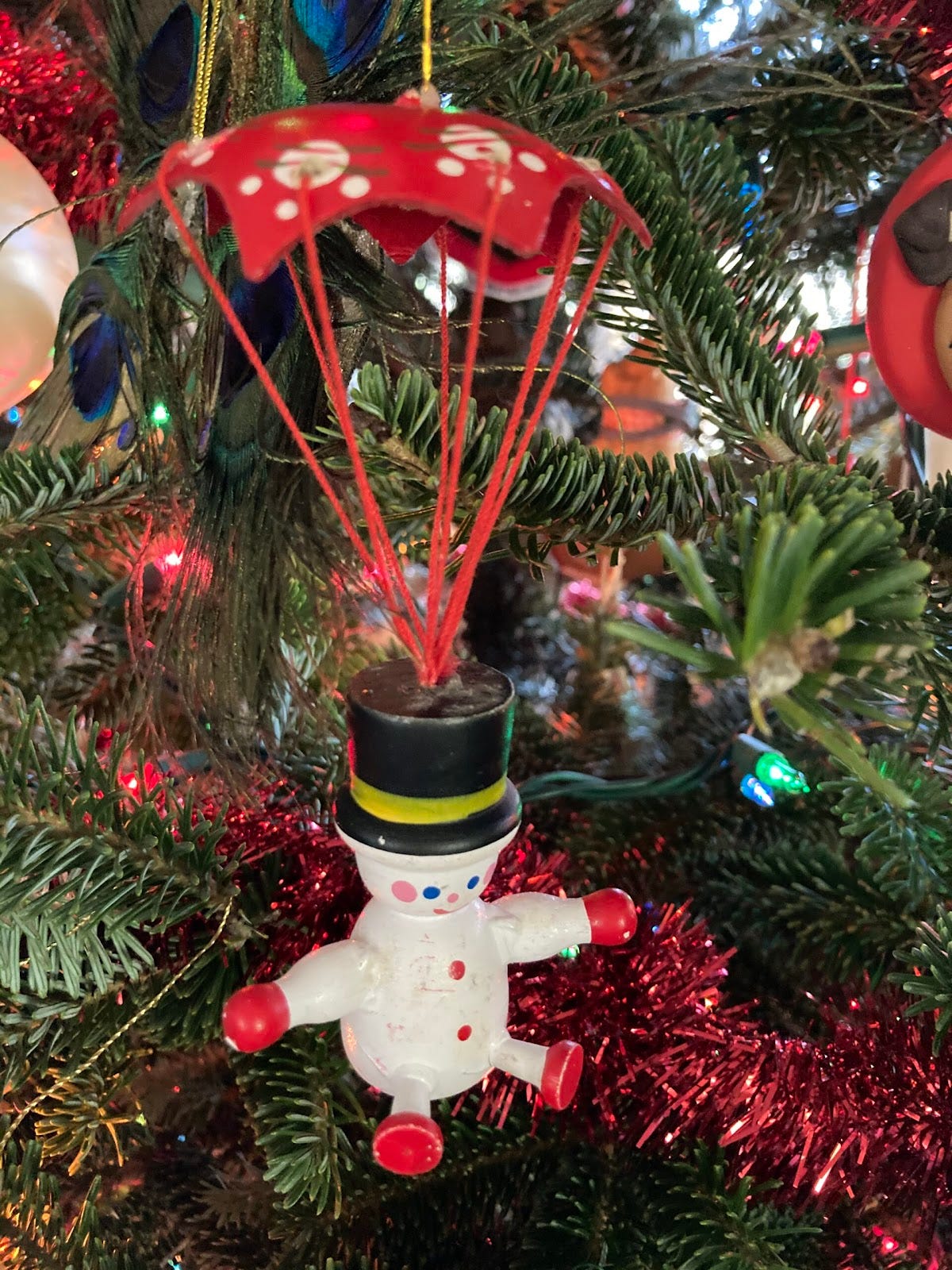There’s plenty of pure whimsy, too, from the “Mistletoad” to Yoda and other Star Wars and Star Trek characters. There are nostalgic ornaments passed down through generations, like the parachuting snowman or the Santa pilot. There are ornaments gifted to the children based on hobbies at the time – from cooking, to music, to favorite animals. Sometimes irony comes more in the placement of things – the elegant peacock feather butterfly perches just beside the ornament that commemorates the Hi-Way Drive-In, aka the Dip-Dog Stand, a veritable institution, decidedly inelegant, in my hometown.